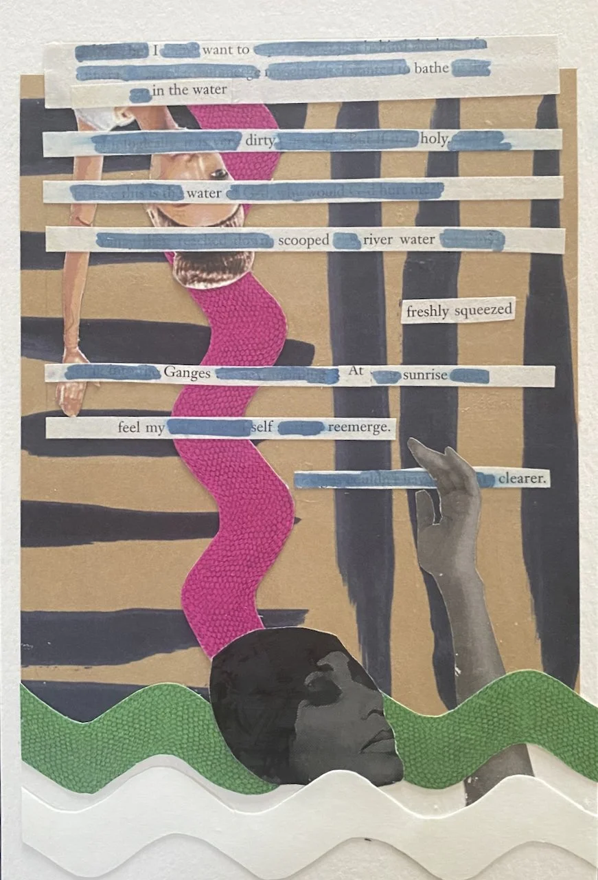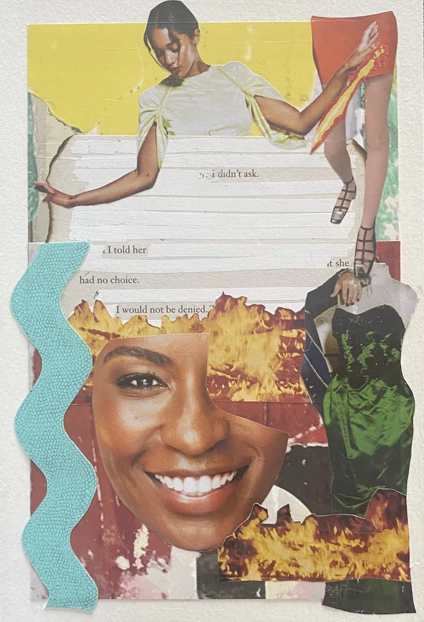from Liminal Spaces (2022—). As featured in Michigan Quarterly Review in Spring 2024. Dream, Mitotic Beginnings, and Disturbance are from a larger work of mixed-media collages utilizing handwritten Nsibidi symbols superimposed on the artist’s photographs of water, shoreline, and skies. This series is an exploration of time, space, and identity in the context of government- and socially-sanctioned crimes against African/descended girls and women.